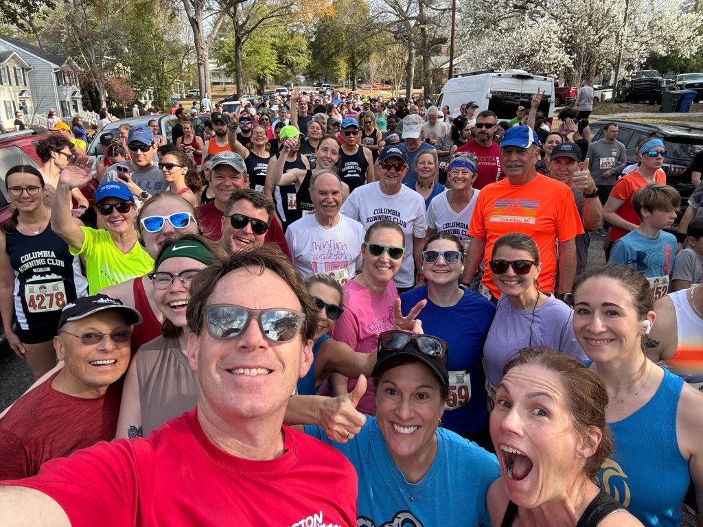 I strolled to the start line with my main goal of breaking 20 minutes again. I was back in marathon training, putting in the long runs, even throwing down a 50k a few weeks ago at Harbison. Fitness should be decent. There seemed to be a fair number of beasts on hand, so I took a couple of steps back from the front. I mean, I’m all about toeing the line, but these frisky gen Z-ers were going to stampede me if I lined up first row. Brandenburg was there with dog in tow, so I figured he might be a good pacer.