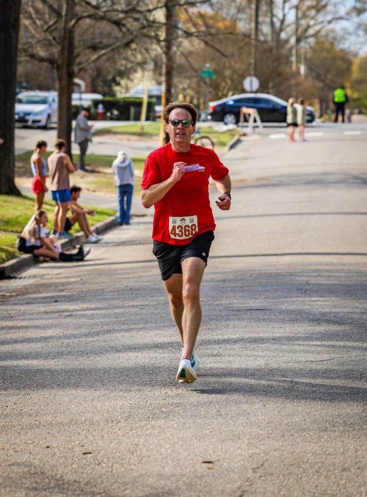 The start was less chaotic with the non-elite field, but apparently, I must have gotten a contact high from the frat bros because I was going hard as a MF for some reason. Drew told me he was glad I was in a different AG now, but I had to inform him, at 5:30ish pace, that I was still 49 until Monday. Grandmasters will have to wait until next week. We turn on Wheat and I try to rein in the effort a bit, because I’m breathing way too hard out of the gates. Up ahead is Parker and masters singlet dude and one other young guy. The pace car is right there so between that, my giant ego and Drew’s elephant footclomps behind me, I am probably not backing off sufficiently. Sure enough, mile 1 (Wheat and Ravenel corner) comes back in 6:06. Yikes. But then giant ego brain convinces me that maybe, just maybe, I’m in that kind of shape now. It should be noted that I run 99 out of 100 5ks with negative splits, so this was not my usual.