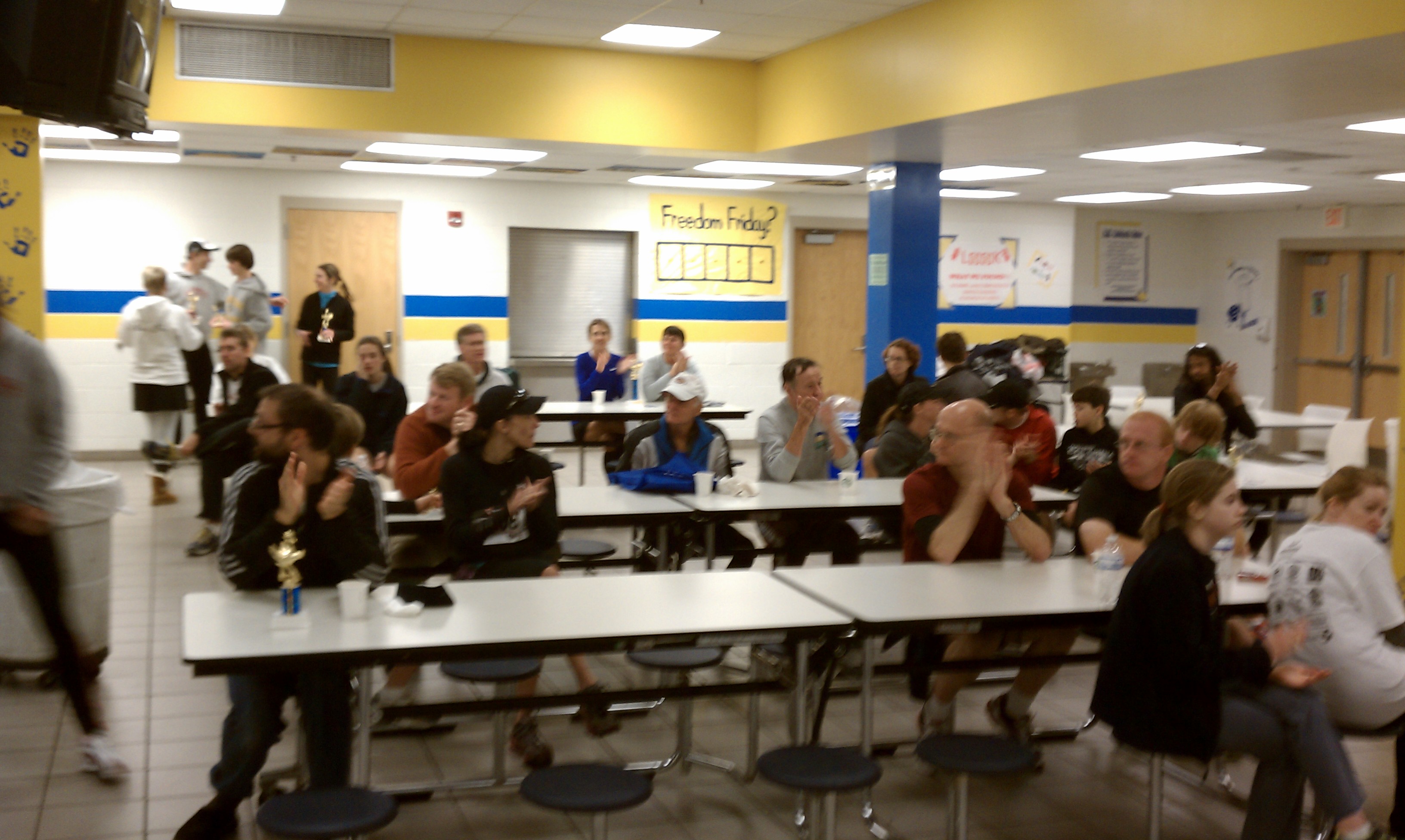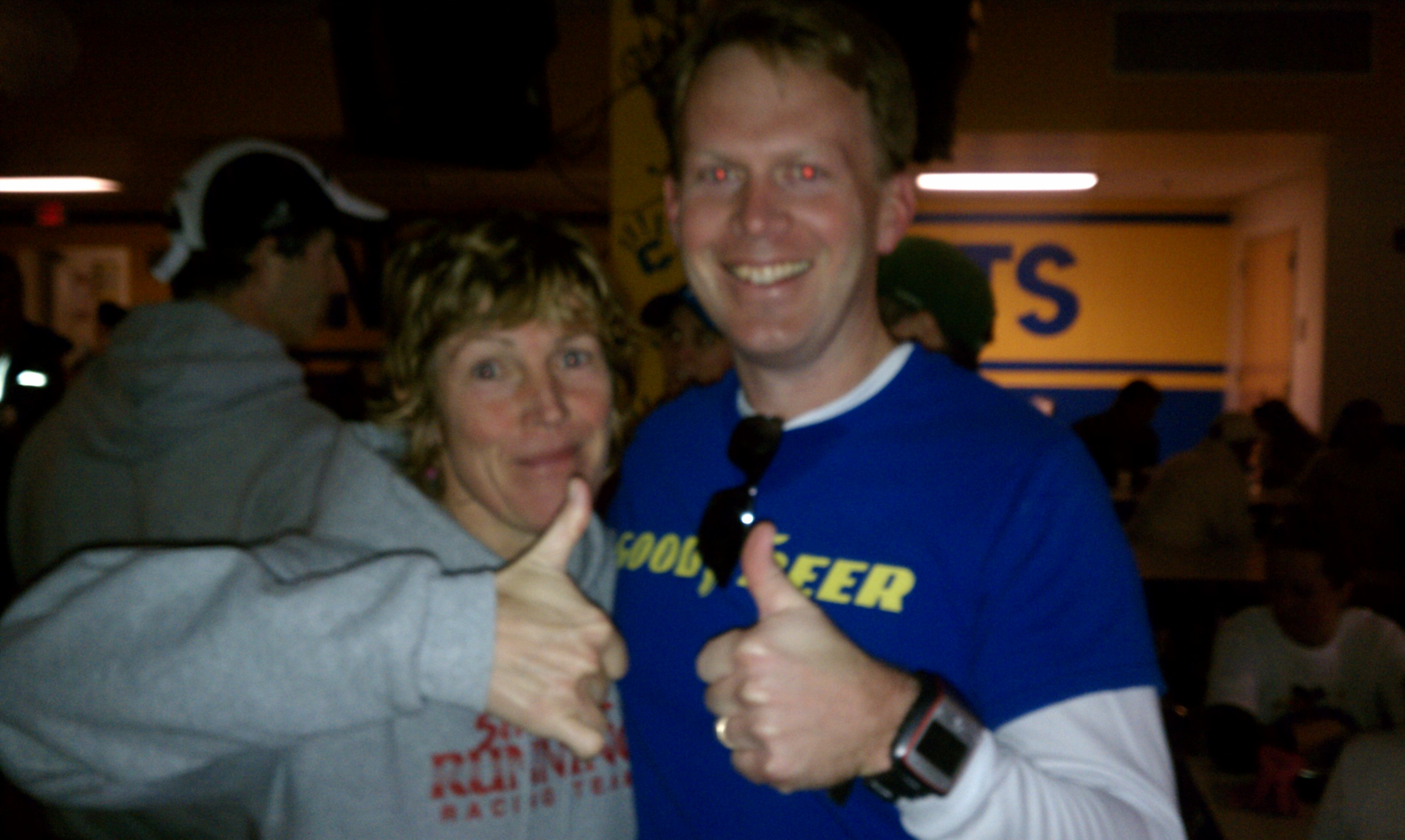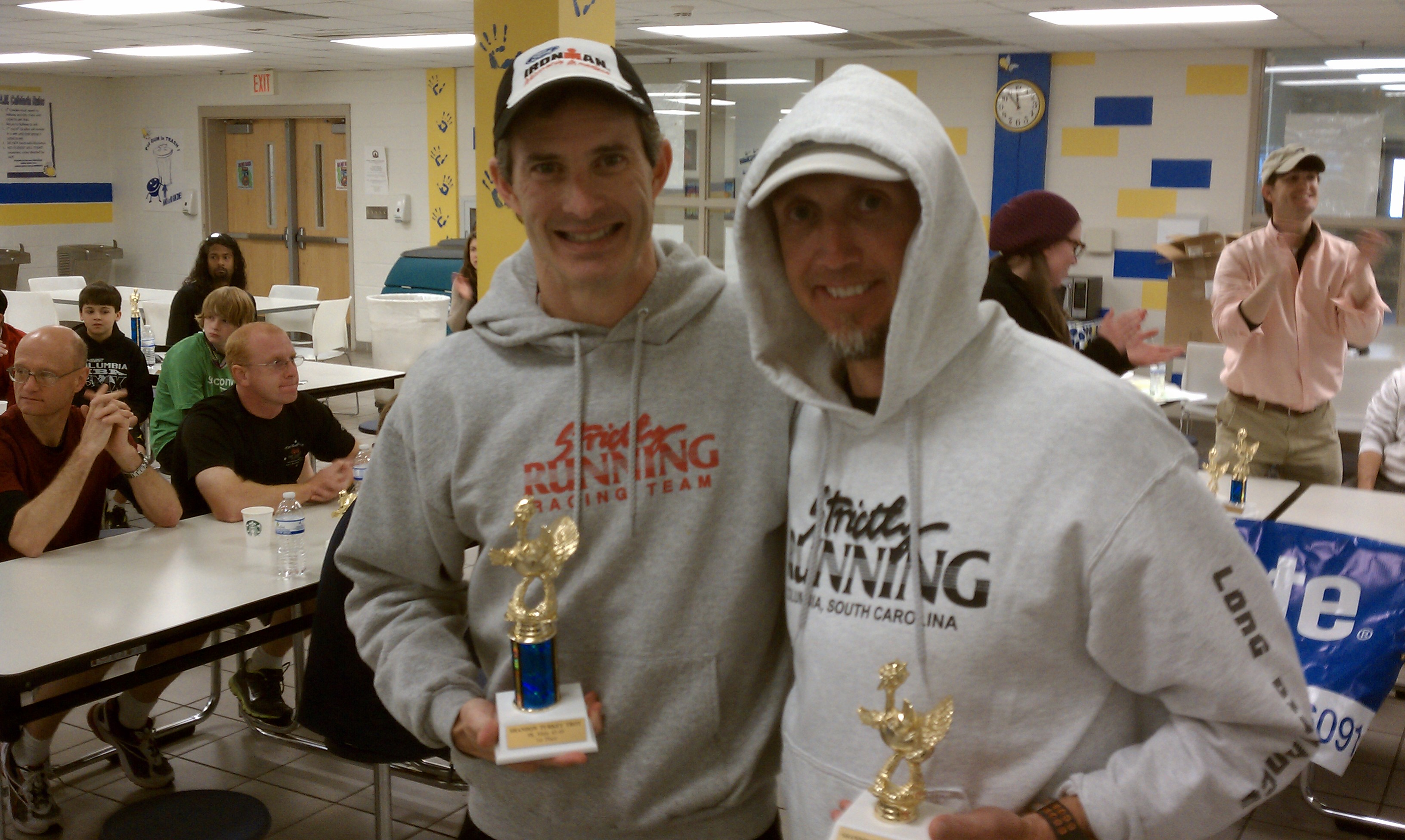 Not a pretty finish, but then mine never are. Thanks to Angel winning the whole thing (in an awesome 29:59) , I managed 2nd in age group and got my turkey trophy. Matt took first. Turns out the other guy near me was like 50 and I was just having 35-39 hallucinations. Aubrey Johnson, a kid who finished behind me in 2009, took 2nd, and Eric Allers took 3rd. JB took 8th and 1st in AG. Amy took the womens race and chicked Brandenburg, finishing 6th. Meg apparently outkicked Amanda and they finished 3 seconds apart. Geary had a very strong race and gapped me just enough to fend off the blue shoeing. I took 14th overall, followed by Tigs and Greg, who took 1st and 2nd in thier age groups, Sarah by over 10 minutes.