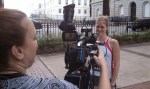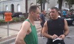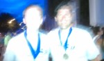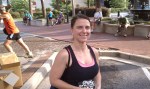 Starting to hate life about this point. I was breathing hard, but the heat was the worst. Engine definitely in the red zone. All of a sudden I can hear someone coming up behind me, and I prepare to get Tisdaled, but its some dude on a skateboard. I can tell my pace is suffering because Yerger is leaving me for dead. Claudia drops off a little but is still way ahead of me. We finally round the last turn, and there’s a seemingly endless straightwaway to the finish. I can make out the time in the 18’s but it takes forever to get to the line. I try to throw down a meager kick but I am toast. The only thing keeping me going is a paralyzing fear of getting blue shoed by the two behind me. I see Justin cooling down on the side and I try to follow his form pointers, though I can feel my arms wanting to seize up like a chicken and by enormous melon wanting to tilt back and to the side like Im on a roller coaster from hell. Maybe I am. Finished at 19:34, 8th place overall, 2nd in AG behind Yerger (19:05). I was half delirious after the race, sitting down to take my chip off that didnt exist (the chip was in the bib). Heart rate was like 2000 and just sucking wind like crazy. Giving “110 percent” apparently is not a problem for me. Tisdale finished in 19:54, Meg in 20:15 and 2nd overall female.