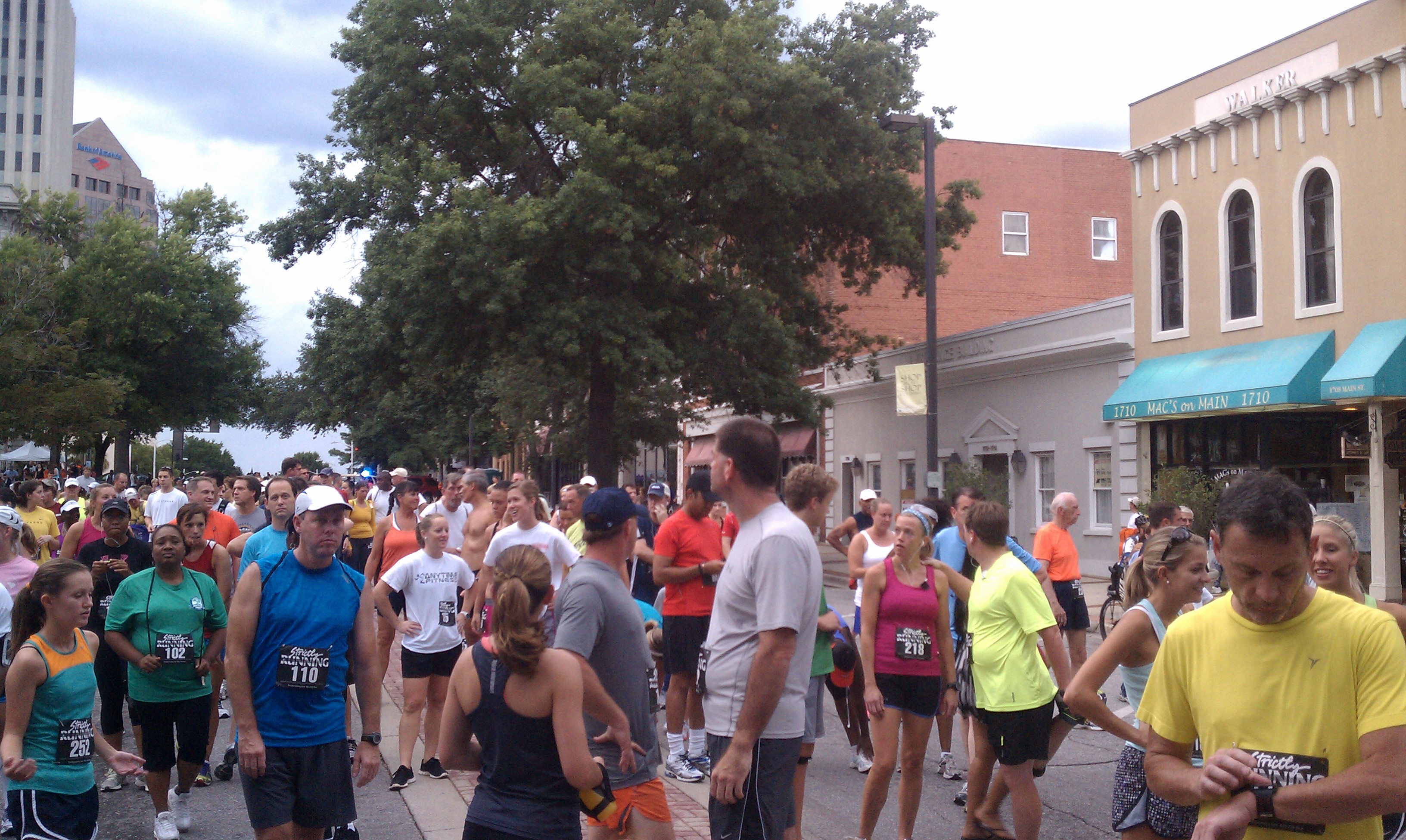 This year I was thinking I would sit it out though. I had a rough week after running an all-out 400 meter and 800 meter at Strictly’s track series, plus one of my cute little disease carriers had given me a cold. A crappy night’s sleep on Thursday, and I was going to be glad to take a rest. I figured I could satisfy my executive duties in the Columbia Running Club by showing up and taking pictures, and that might actually be fun. But then I came home from work and a little package was by the front door. The blues. Not just in color, but a pair of the actual adidas adizero adios that started the obsession and gave me my first sub 20 5k on the first try. I was heartbroken the last two years, because adidas changes colors and styles constantly, and the last two adios incarnations were a bright RED. I cant go around wearing RED shoes, can I?? Jeez. So I’ve basically worn all kinds of shoes since then, the only common factor being the color. But this week my heart skipped a beat when i saw the 2012 version was blue again. I was as giddy as a schoolgirl, ordering them immediately and even paying the ridiculous 10 bucks to get them 2-day shipped. So when I saw them on my doorstep, I had to at least break them in, right? I would just walk around in them anyway.