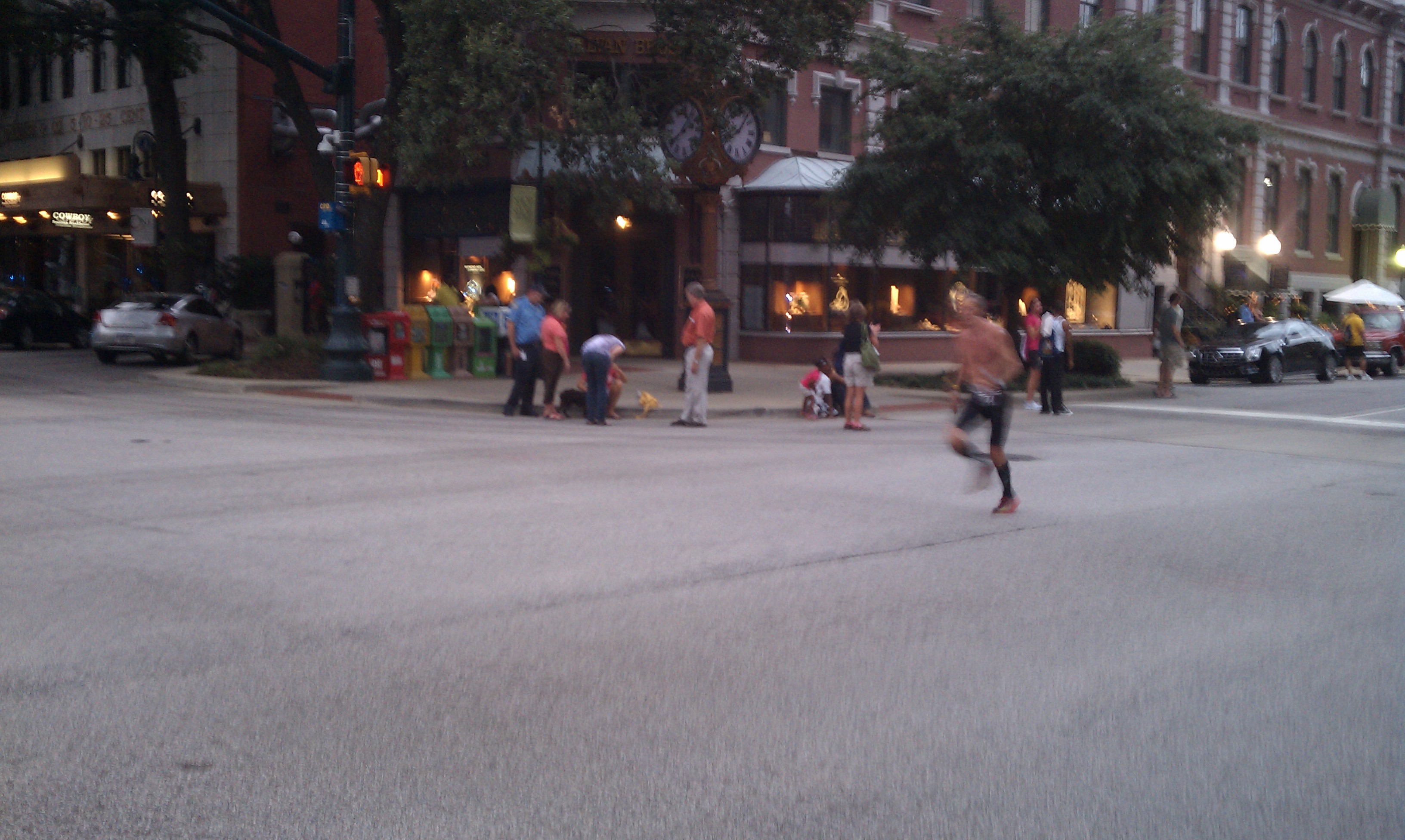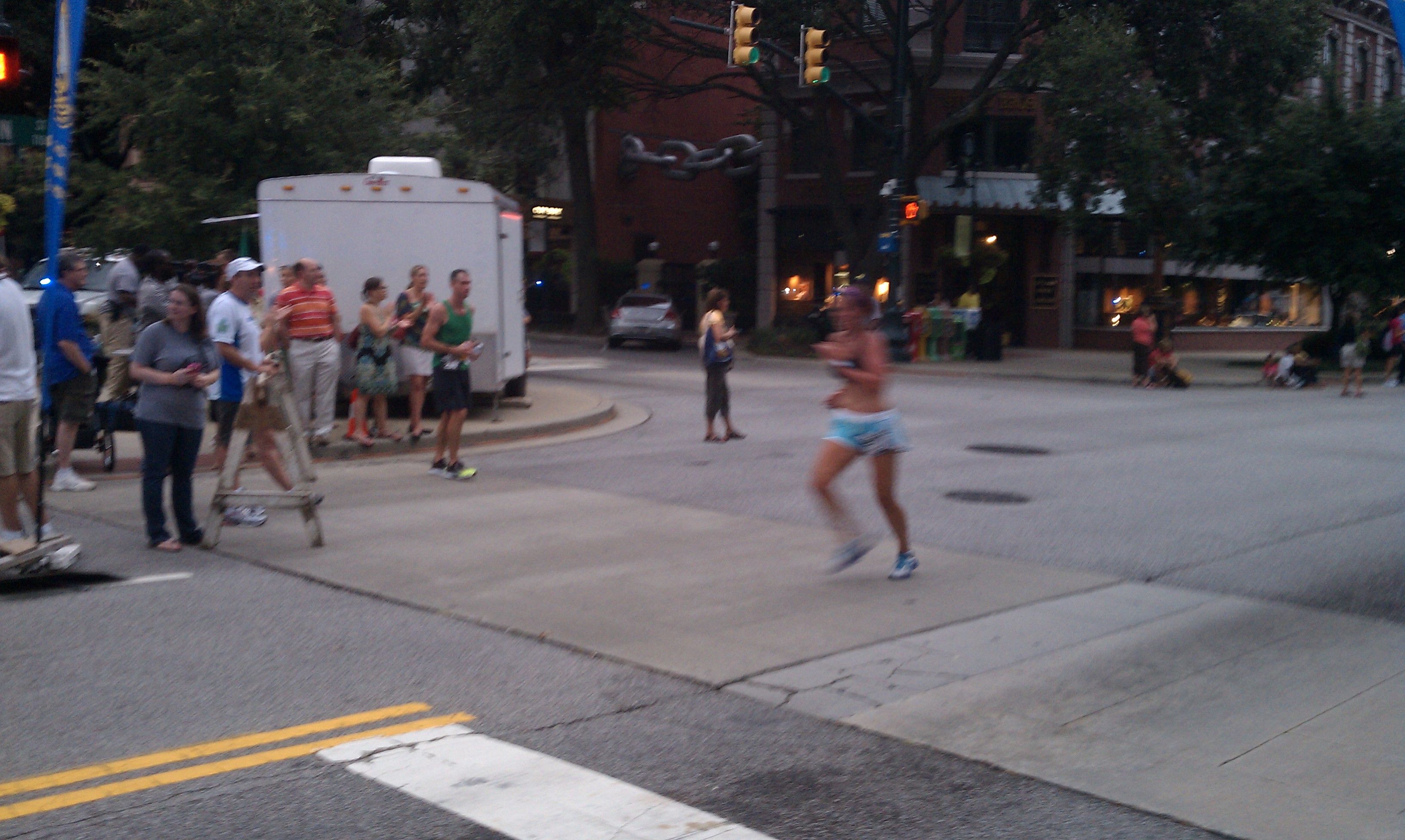 5:51??!! Ruh roh raggy. This is suicidal pace for me under any conditions but particularly when its over 80 degrees. But apparently my head is both gigantic in both the literal and figurative sense, because I don’t slow down…yet. As we make the turn onto Greene and head back on Sumter that nice breeze we had seems to vanish. It gets real hot, real quick. Whats worse is that I feel completely alone at this point. I can see Yerger and Claudia about 50 meters ahead and can hear no one behind me. But I know the Tisdale and Weis combo cant be too far behind. Unfortunately I have no sense of my pace anymore, and no one to push me. I near the next turnaround, which coincides with the 2 mile mark. I ‘m desperately afraid of Meg paying me back for passing her at this point last year, especially since I trash talked about it on facebook. I dont look at my Garmin this time, though later I see I dropped it down about 30 sec (6:22)