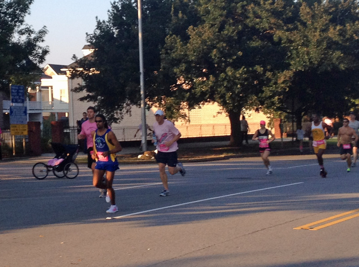 I got to the stadium about an hour early, did a warmup with the Code, Billy, Trophy, Rick, and Larry. I could attempt to name everyone that I saw at the race, but it would be easier to name who I didnt see from the Columbia running community. I have a highly developed sixth sense for seeing 35-39 people, so I could tell it was going to be tough going age group wise. Angel wasnt there…so that was one “way too fast , no way in hell you’re going to beat that guy” out of the way. But..Newly 35 year old Drew Williams and Steven Johnson, along with the Code, basically c-blocked me out of a trophy before I stepped to the start line. The Yerger was also there, but had done 11 miles already, and swore a tempo pace for the race. Which is still pretty fast. And since this race is so big, there were sure to be randoms out there to take away my precious trinkets as well. Damn them.