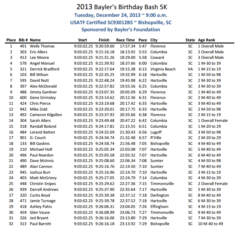 baylersresults Published December 25, 2013 at 789 × 738 in Bayler’s Bash 5k – Bishopville, SC – 12/24/13 ← Previous Next → Post a comment or leave a trackback: Trackback URL.