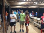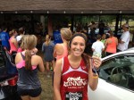 I reach the top of the monster at a near walk and my teen friend stops for an extended water break. I can see Code way up ahead but no way can I muster a chase. Pace has been hemorrhaging into the sevens for the last couple of miles and the humidity is making my shirt feel like a wet blanket. One more little incline and we are finally back on Main st near the start. I start to make the turn towards the finish when a volunteer yells and I realize there is yet another quarter mile loop of fun left. Good times. At least its flat, though – probably the only level part of the course. I finally see the finish and try to kick it in for Erika’s camera but you can stick a fork in me. Crossed in 44:20, 5th place and 2nd in age group.
