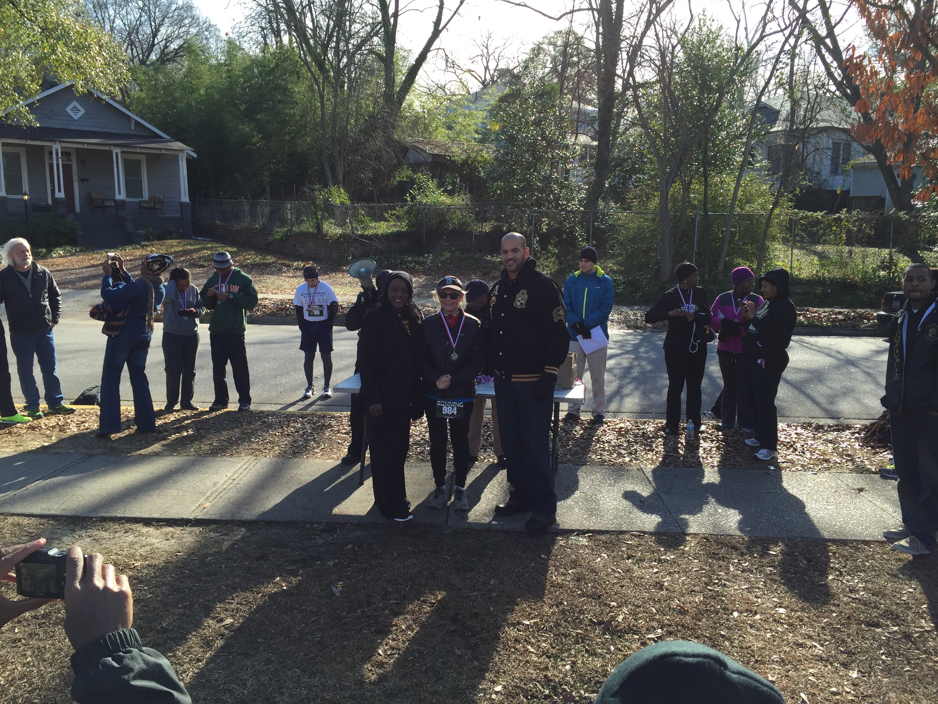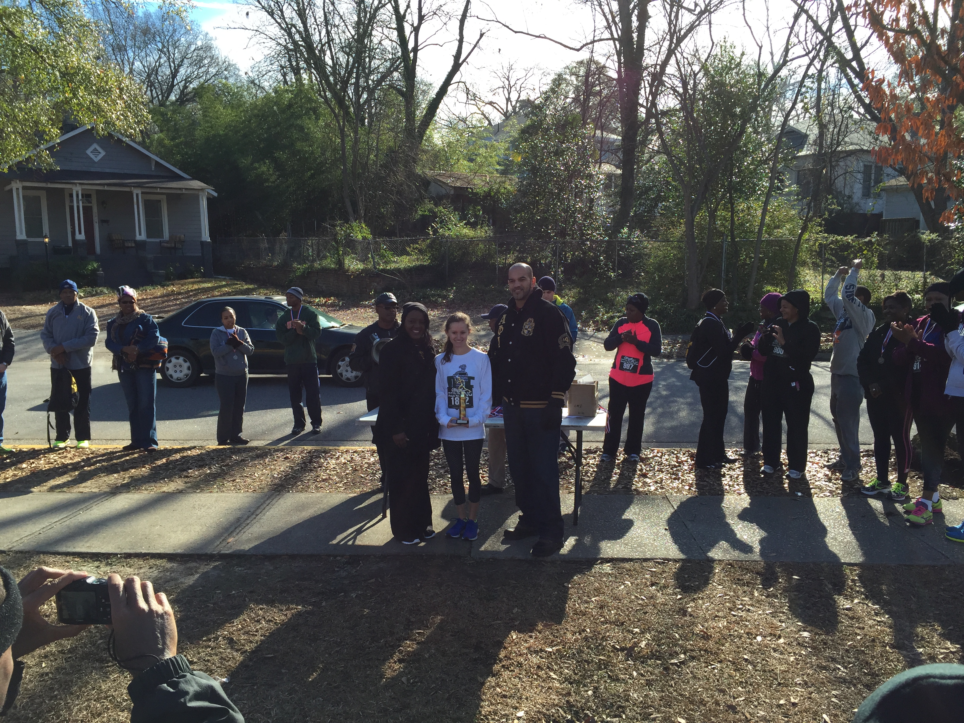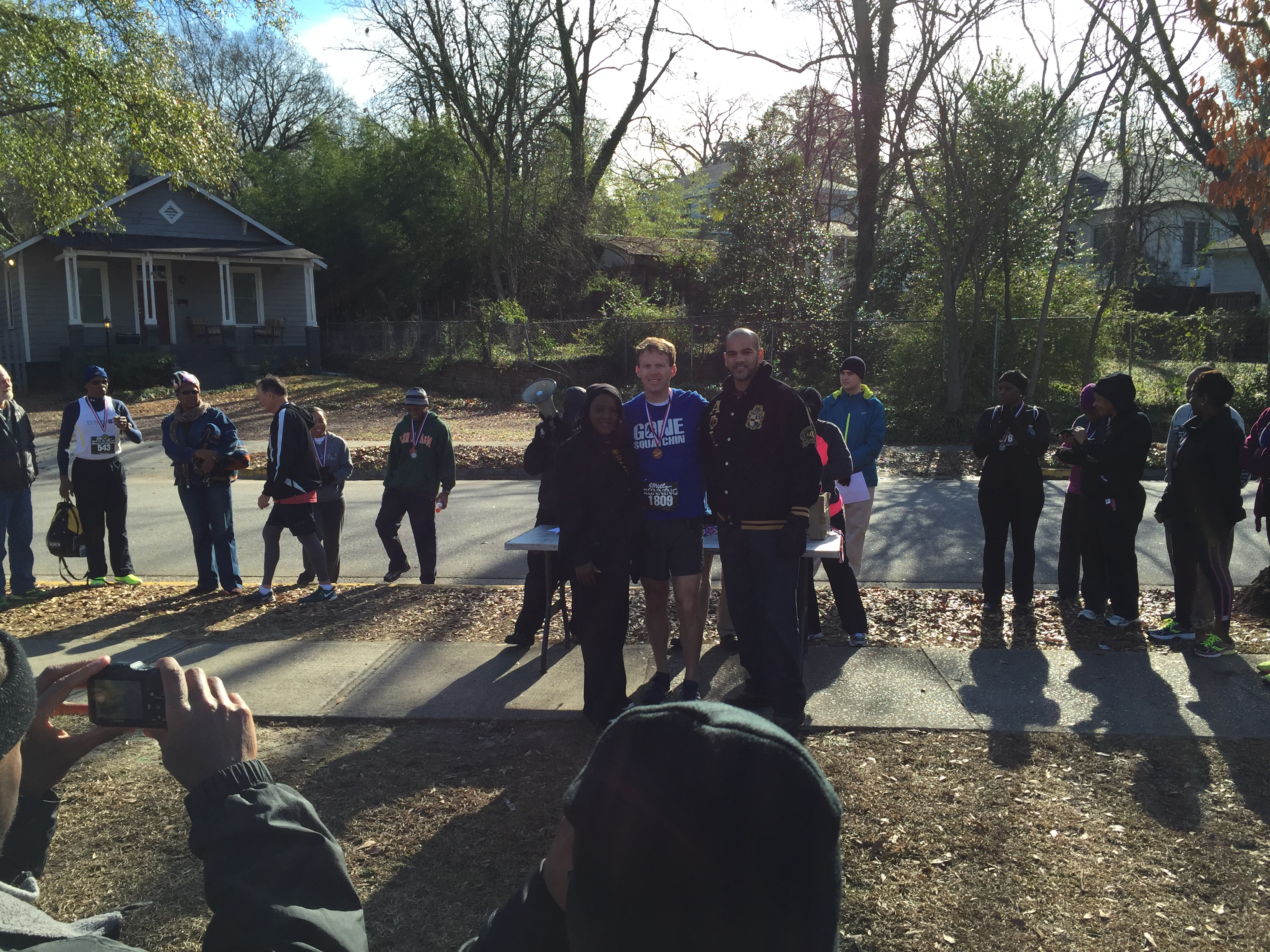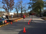 I’m not there more than a few minutes before I see my trophy chances getting a lot slimmer. OJ Striggles, Plex and Brandenburg are all on board. Yeah, the holy grail (i.e. the overall win) was not to be had at this one. Plenty of familiar faces in the small crowd. James Hicks was ready to pick up some 35-39 points, since none of the other regular age groupers were there (though I keep forgetting OJ is in our group – doh!). Thomas Beattie was replacing Wes Spratt in JB’s tri entourage, with Barb filling out Team Brandenburg. Albert Anderson and Arnold Floyd were sure to make the 65 and 70 year age groups faster than almost everyone else. Pete Poore was out for his 25th consecutive MLK – now that deserves a trophy. His main rival, Alex P., has now aged up to the 65’s, but still ready for a Poore/Ponomarev showdown. Eric McMichael was ready to test his new masters wheels (just turned 40).  John Gasque, Lisa Smarr and Rocky Soderberg were representing just a few years of CRC membership. Newly minted CRC member Leeds Barroll was out to add to his 2015 TDC point collection, having already started at Resolution run. Laurie Royson is grooming a next generation CRC/TUS member with  son Cotes. Dutch Fork’s Anna Johnson was there for an easy win.