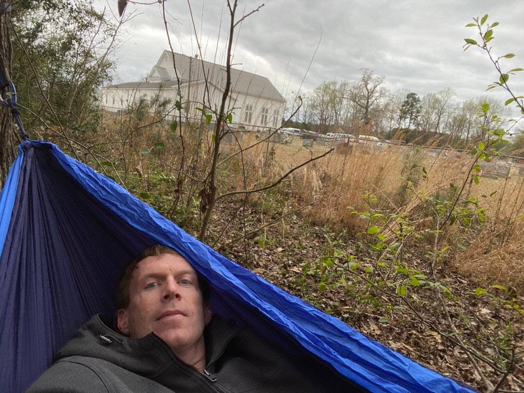 We made our way to the exchange zone for the start of our van, Jericho Methodist church, just outside of Elloree. With hours to kill, we all set out to try and maybe nap a little. I had my hammock, but had to go traipsing through the woods to find two suitable trees, right next to the adjacent cemetery. I tried to sleep put the cold wind and creepy trees and graves probably didn’t help. The ladies manning this zone were super nice, and perhaps most importantly, let us use the ACTUAL BATHROOMS at the church. When you’re facing the unique olfactory and immunologic terror zone of portapotties for 24 hours, real running water is like a gift from God. We were at a church I guess. I ran into CRC alum Matt Gregory, who had moved to Greenville, but was back to run with the Lexington team “Fast Times at Lexington High”. He said he was off his training due to the new baby but would be doing his best. Good to see a familiar face and that his team was at least half dudes that were actually of legal drinking age.