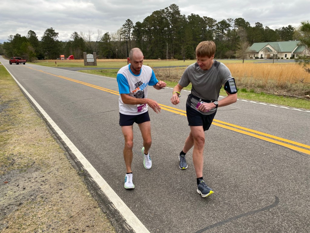 Lexington cruised into our zone first. They had a few minutes on us, but Brian had texted that Van 1 was already beating the spreadsheet. Before long Nate took off, followed by Dan. By the time Code was scheduled to leave from the Elloree exchange, our two fastest had made significant gains on the Lexington team. Their next guy was dressed like it was 30 degrees out, so I told Code he was primed to take him down and record our first roadkill. Our next zone was actually back at Santee State Park, having completed the Columbia loop. Awaiting me there was Andy Richards with his ceremonial Blue Shoes toilet paper. He’s been doing it every year since he saved me from a paperless portapotty back in 2016. And I am eternally grateful.