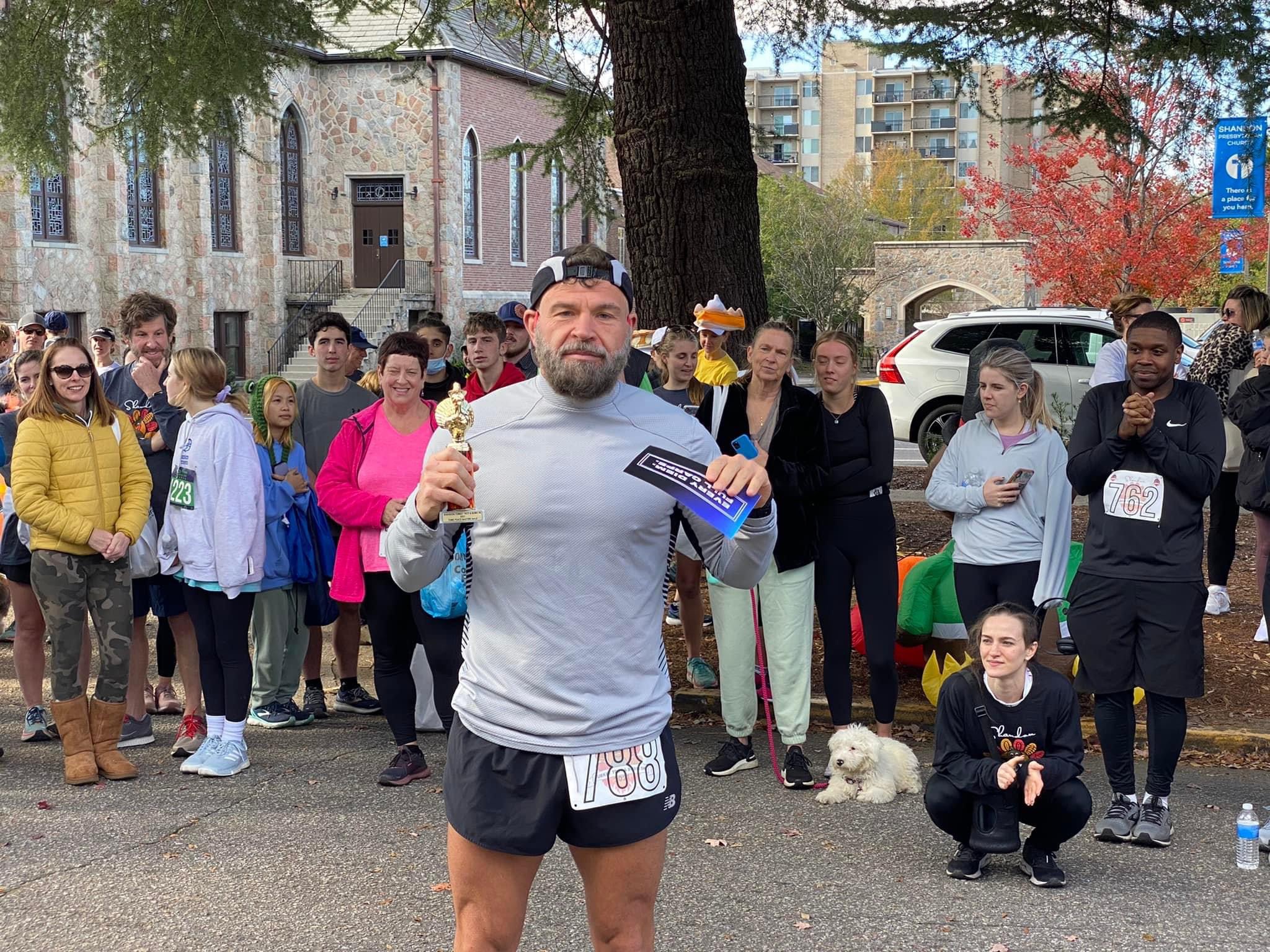 Age group honor roll, men: Regan Freeman got turkeyed but pulled out a nice 19:41 for 1st in 25-29. Ian “don’t call me loff-lyn” Loughlin took 2nd in 23:50. Seth Lapic got his sub 20 with a 19:52 and 2nd in the 30-34. Antjuan Seawright won the 35-39 with a nice sub 22. Yerg edged out Justin Campbell for 2-3 in the 40-44, with Dr. John Baker just behind. At least he had another epic blue shoeing of Lindsey Hendren to make him feel better. I managed a 1st in the 45-49 and the best turkey trophy ever, proudly displayed on my desk. Randy SILENT H Hrechko captured yet another sub 20 and the 50-54 win. I guess body pump and 25 miles per week works. Jeff Brandenburg, Ed Aufuldish and Frank Seier swept the 55-59 podium with Clay Ham just behind. Dave Hale had a winnah winnah chicken dinnah by placing 3rd in the self-proclaimed “geezer jock” division of 60-64. Pete O’Boyle crushed the 65-69 division by 7 minutes, with Leeds coming in 4th just before his 70th birthday. The ageless Alex Ponomarev placed 3rd in the 70+.