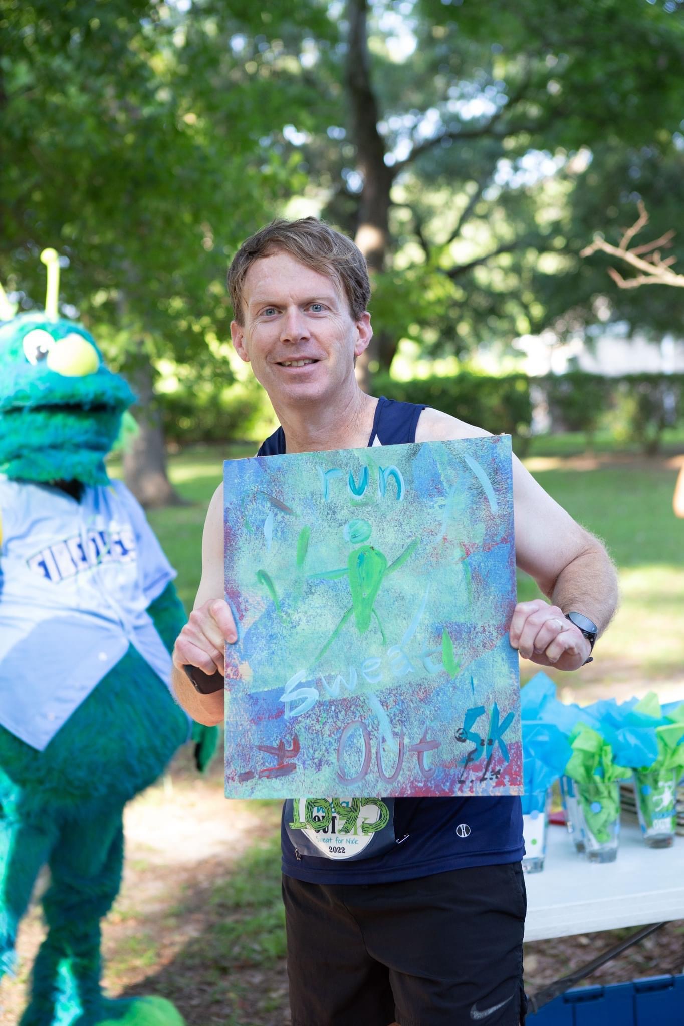 The Sweat it Out 5k started out 8 years ago as a small independent race, but over the years it has grown to be one of the more competitive events on the tour. Held in the area near Meadowfield Elementary and Hammond Academy behind the VA, the course is a fairly flat and fast route and typically provides the last decent chance at a fast time before the summer heat really sets in. Erin Roof took over race directing early on, so true to GRIT form, there is great post race swag and food, wth chick fil a biscuits, coffee and the signature Chicken Man painting awards. Don’t forget the free beer at Hunter Gatherer at packet pickup on Friday. (I certainly don’t) The race goes towards a good cause as well, benefitting the national foundation for ectodermal dysplasias. The cause and race is in recognition of Nicholas Duke, who has an ectodermal condition that makes it impossible for him to sweat.