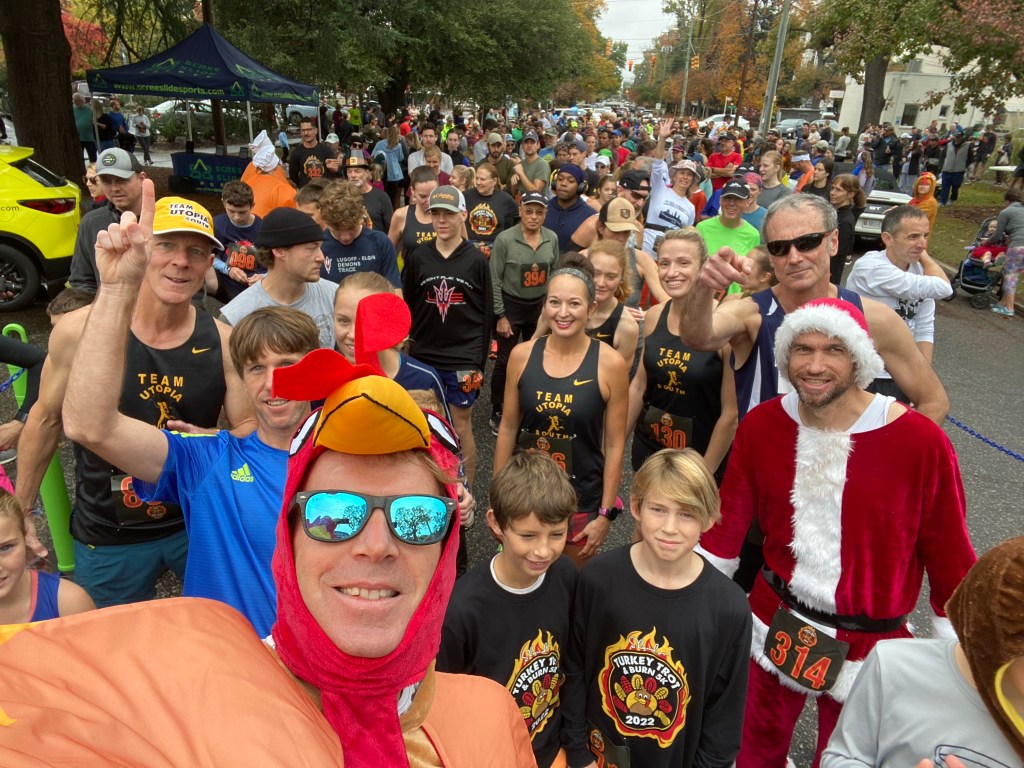 This year was going to be interesting, though. Interesting, in that I usually don’t prep for this race with a grueling multi-surface 50 miler in rural Maryland 5 days prior. So yes, legs were just a little wrecked. But I wasn’t going to miss this one. I mean being the unofficial GRIT spokesmodel is one thing but shaming decent runners by getting turkeyed is a unique perverse joy. Secret… despite its hideousness, the skirt-like undercarriage of the costume actually doesn’t slow you down too much. I mean the turkey PR is a solid 19:08, just off the all-time cosplay PR of 19:03 in the green velour of the Lucky Leprechaun. But hell, I wasn’t touching those numbers this year, even without the ultrarunning leg destruction.