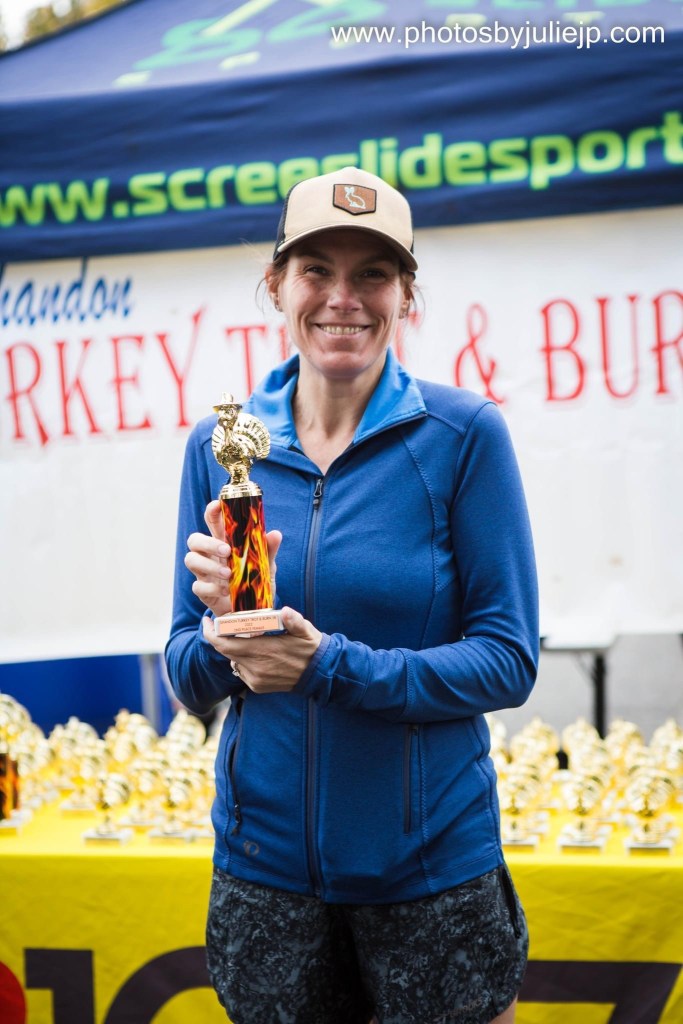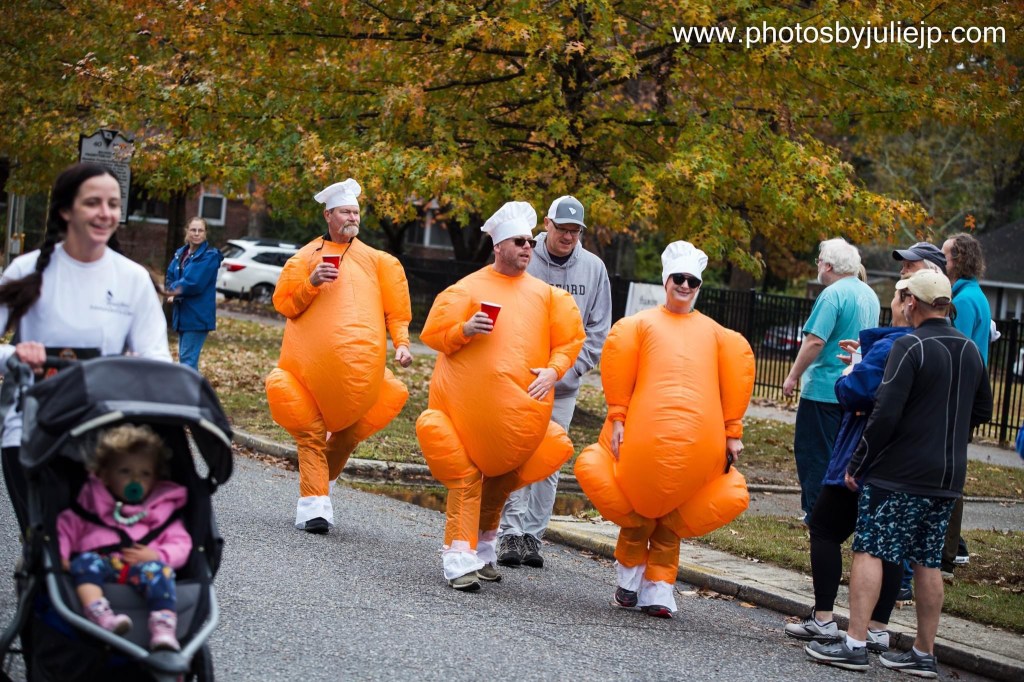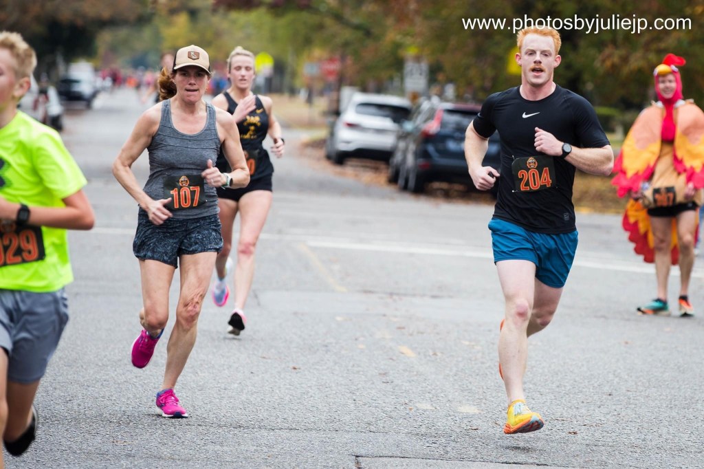 The Shandon Turkey Trot and Burn 5k, put on by Erin’s GRIT endurance, is now in its 7th year, and the race goes to benefit theShandon Neighborhood Council. The origin of this race actually dates to the 1980s, as the original Shandon Turkey Trot was a 4k/8k event that was held for over 30 years at Hand Middle School. That race was renowned for its cool turkey trophies, which I’m sure still exist among my “Raiders of the Lost Ark warehouse” trophy boxes in my attic. I know, I somehow still have trouble throwing away even generic winged foot medals from who knows which race in 2009. I have a serious problem. Sadly, the race kind of petered out in the late 2010s with declining participation and eventual degeneration from awesome turkey trophies into (GASP) paper certificate age group awards. Shudder to think. Luckily, they contacted Erin to revamp the race in 2019 and registrations have skyrocketed after missing a year for COVID in 2020. Turkey trophies were back as well. A mainstay of the race has been a costume contest, and this race remains perhaps my favorite non-Halloween cosplay event. Every year I drag out my turkey costume, which has grown, if it is even possible, more hideous over the years. I mean there’s the giant turkey gut and even a solid B-cup turkey “breasts”, topped off by the gobbler headpiece, which really makes the whole ensemble. Its original glory is preserved on the main pic of the race site here: